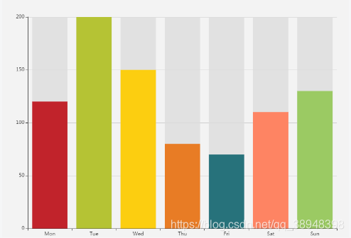 option = { xAxis: { type: 'category', data: ['Mon', 'Tue', 'Wed', 'Thu', 'Fri', 'Sat', 'Sun'] }, yAxis: { type: 'value' }, series: [{ data: [120, 200, 150, 80, 70, 110, 130], type: 'bar', showBackground: true, itemStyle: { normal: { color: function (params) { var colorList = [ '#C1232B', '#B5C334', '#FCCE10', '#E87C25', '#27727B', '#FE8463', '#9BCA63', '#FAD860', ]; return colorList[params.dataIndex] }, }, }, backgroundStyle: { color: 'rgba(220, 220, 220, 0.8)' } }]};
